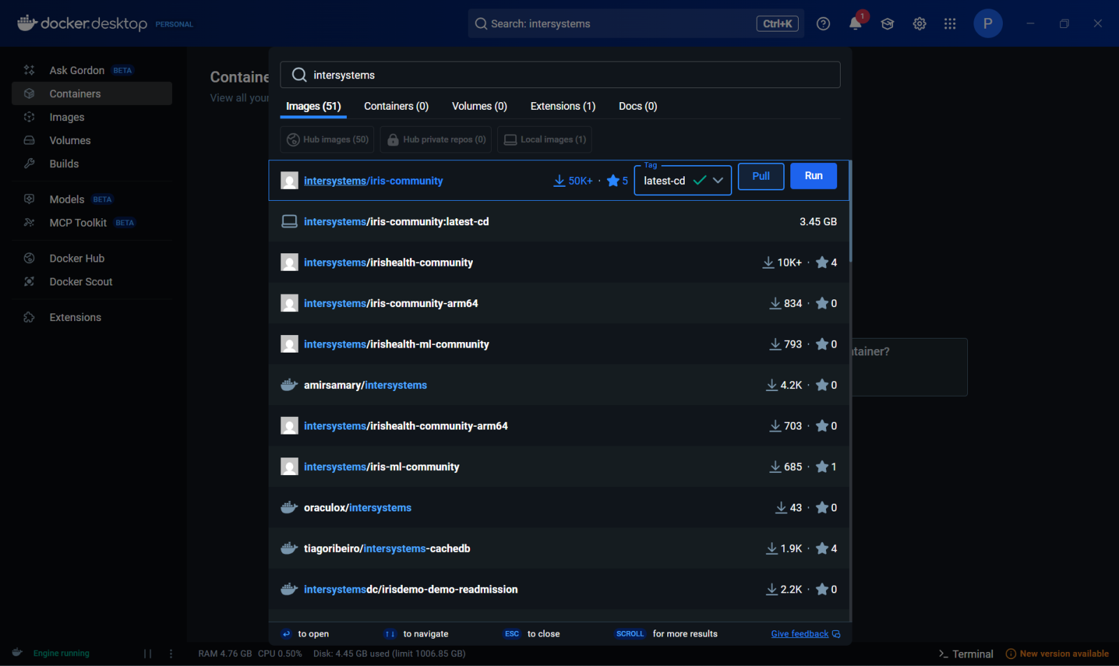 docker pull intersystems/iris-community:latest-cdAlternativamente, você pode pesquisar por iris-community dentro da barra de pesquisa do Docker Desktop e clicar em Pull: