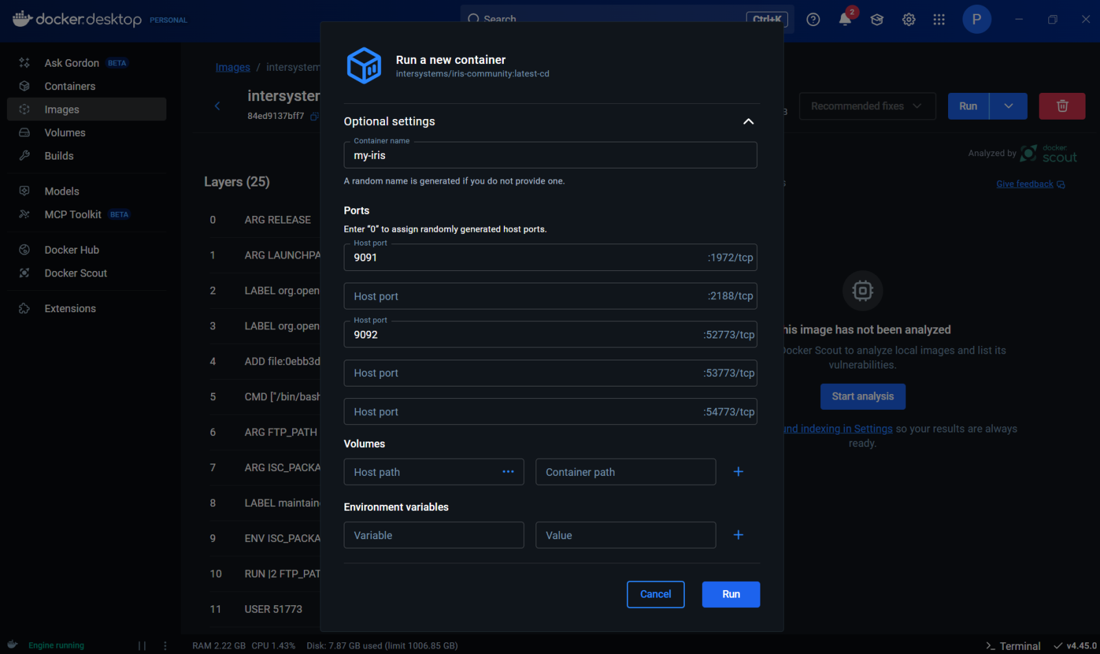 Você pode iniciar um container do InterSystems IRIS Community Edition chamado "my-iris" através da interface do usuário do Docker Desktop simplesmente clicando no botão Run da imagem que você deseja executar no painel Images. Para a imagem do InterSystems, é possível especificar algumas configurações opcionais, como quais portas expor em sua máquina host para se comunicar com os serviços em execução dentro do container.