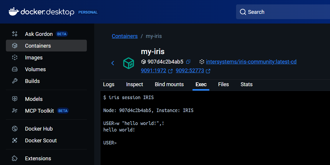 docker exec -it my-iris iris session IRISNeste ponto, você pode invocar o ClassMethod a partir do namespace USER com o comando: