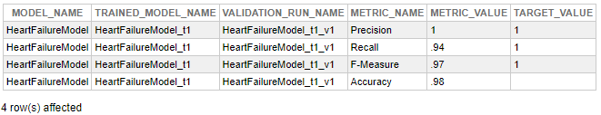 -- uma validação em um conjunto de dados de teste é efetuado e as métricas de performance do modelo são calculadasVALIDATEMODEL HeartFailureModel FROM PackageSample.HeartFailureMLRowTest