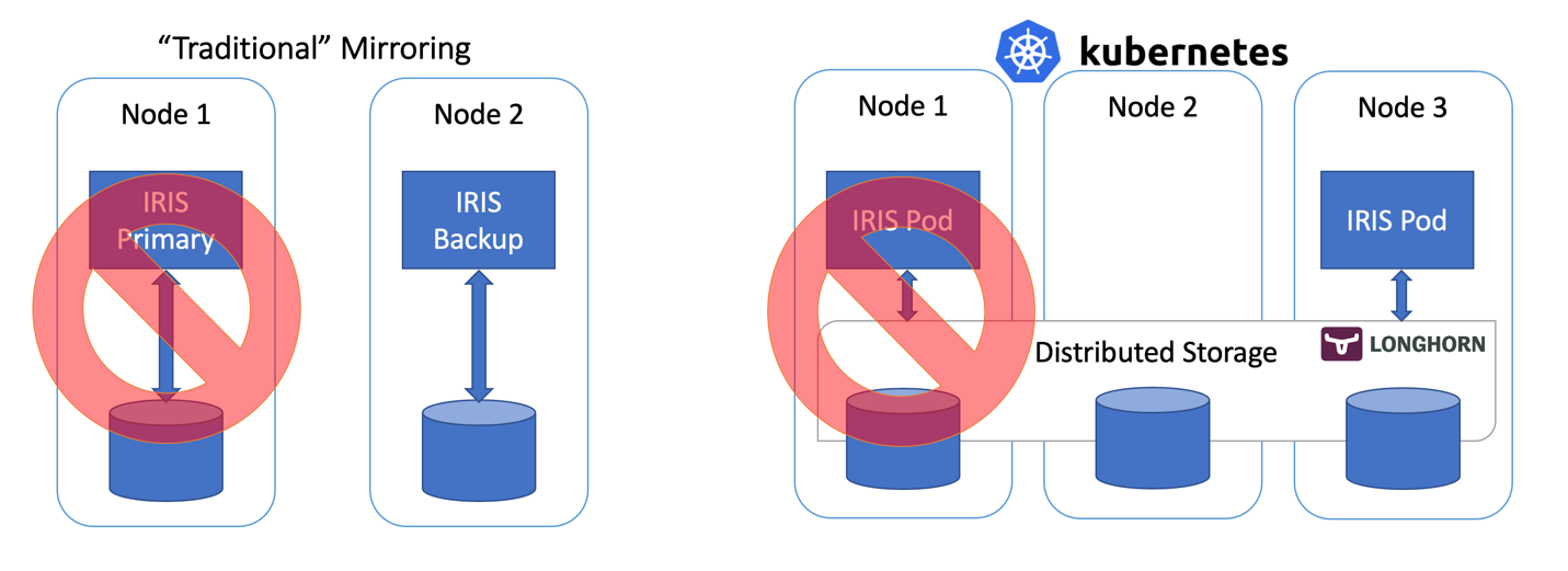 Você pode terceirizar a alta disponibilidade de computação e armazenamento para componentes do Kubernetes, resultando em um sistema significativamente mais simples de se configurar e manter, comparando-se ao espelhamento tradicional do IRIS. Da mesma forma, esta configuração pode não lhe prover o mesmo RTO e nível de performance de armazenamento que uma configuração de Espelhamento.