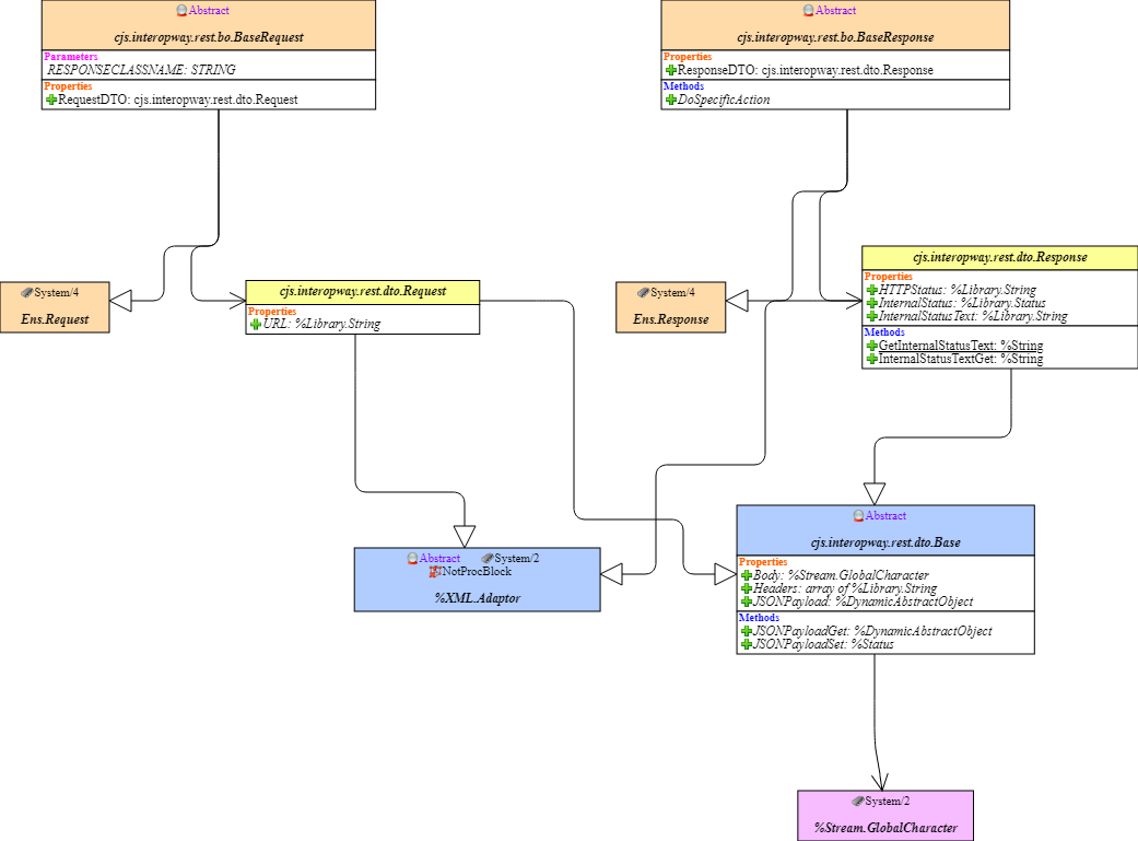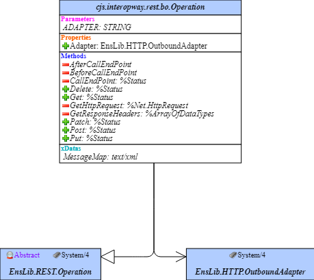 A classe cjs.interopway.rest.bo.Operationestende o Business Operation padrão EnsLib.REST.Operation que possui alguns métodos utilitários e já vem configurado com o adaptador EnsLib.HTTP.OutboundAdapter.