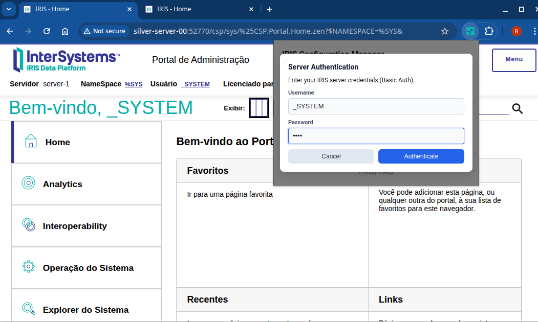 Nesta instância de exemplo usei o usuário _SYSTEM apenas para fins demonstrativos. Deve ser usado o mesmo usuário que você acessa o Portal.
