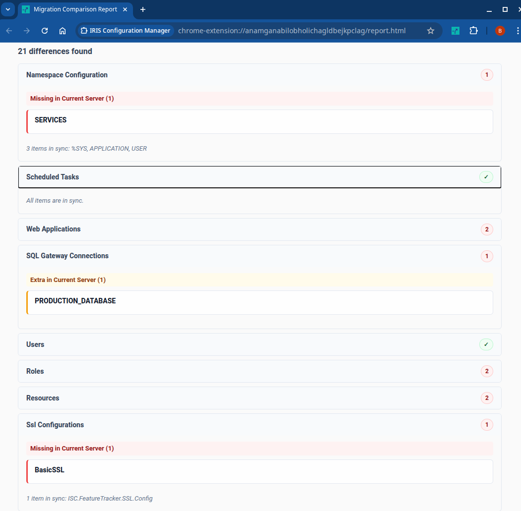 No momento em que estou escrevendo isto, ele compara 8 configurações do %SYS e 5 para cada namespace. Mas a implementação é extremamente simples, então sempre que surgirem novas ideias de configurações para exportar, adicioná-las é muito fácil.