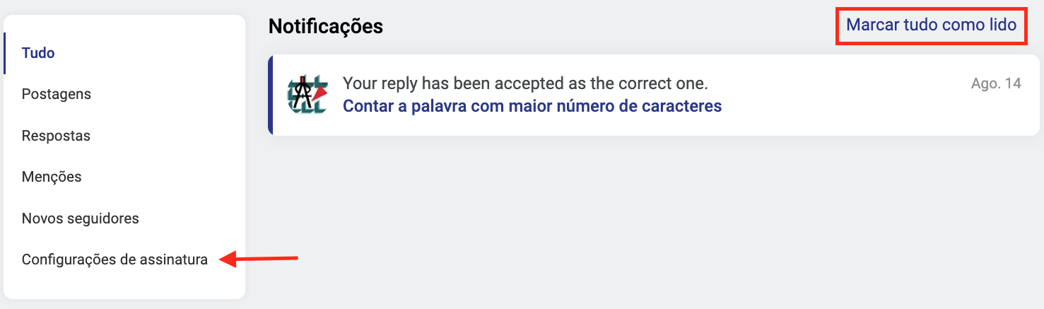 A partir desta página, você pode "Marcar tudo como lido" ou seguir o link para a página que gerou a notificação. E gerencie suas configurações de assinatura.