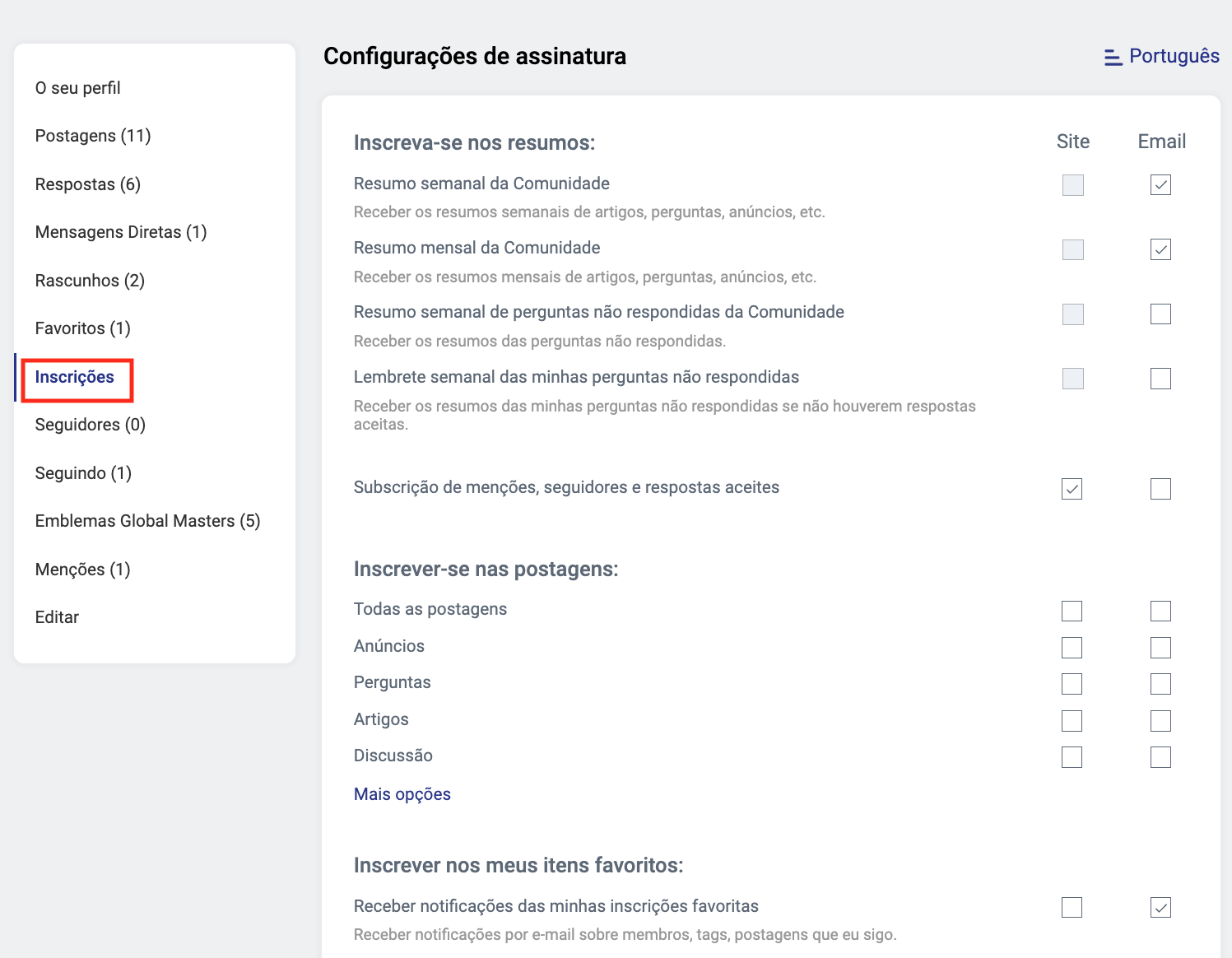 Você pode escolher quais notificações receberá da Comunidade de desenvolvedores, seja por e-mail ou pelo site. Você pode encontrá-lo na seção "Inscrições" da sua conta.