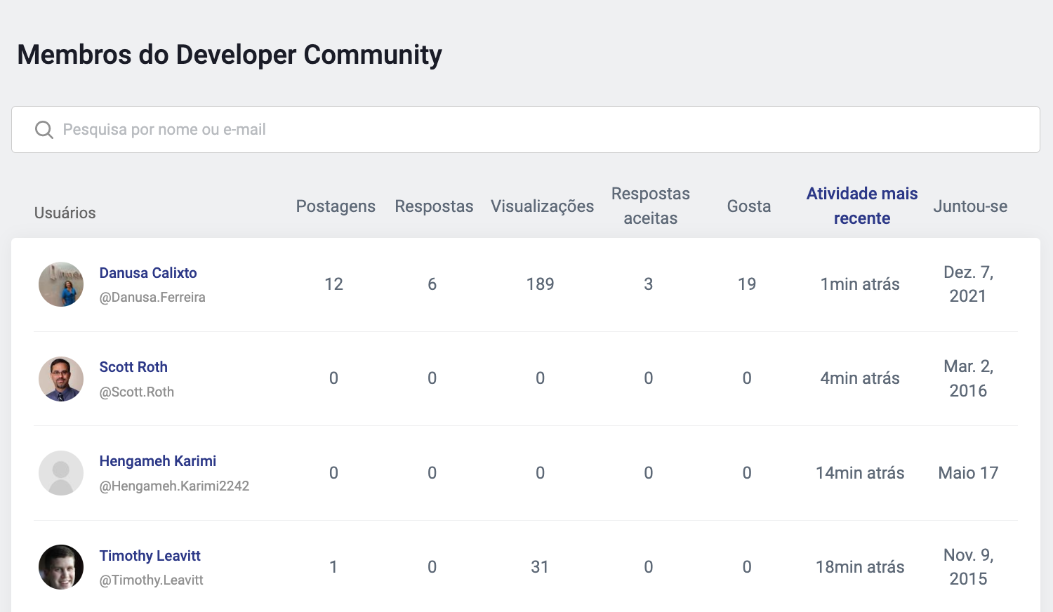 E outra página que ajustamos para sua conveniência é a página "Membros". Adicionamos uma nova coluna "Última atividade". E, claro, não esqueça que você pode classificar por qualquer coluna apenas clicando em seu nome.