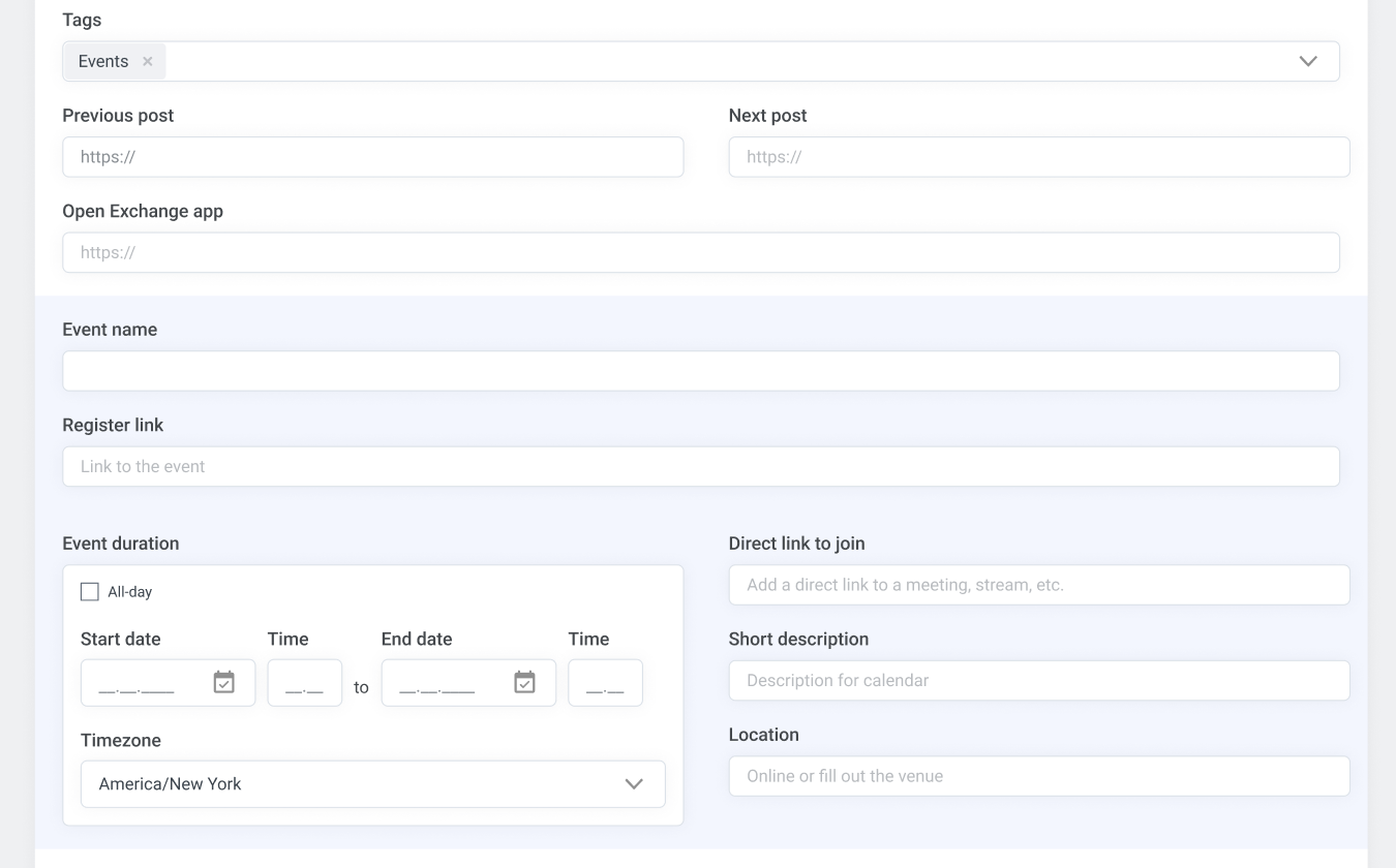 ❗️ Adicionar a tag Eventos a uma postagem irá abrir campos especiais para a criação de um evento: