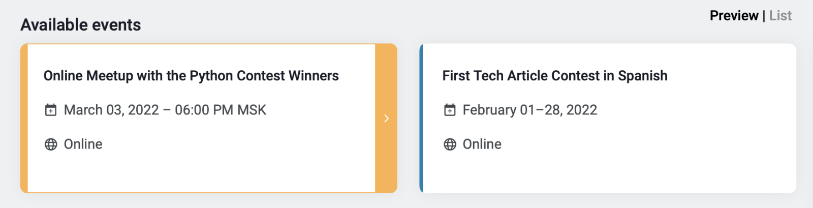 Ao completar os campos com o nome do evento, link para realização do registro e horário, seu evento será automaticamente destacado na página principal, na área de eventos: