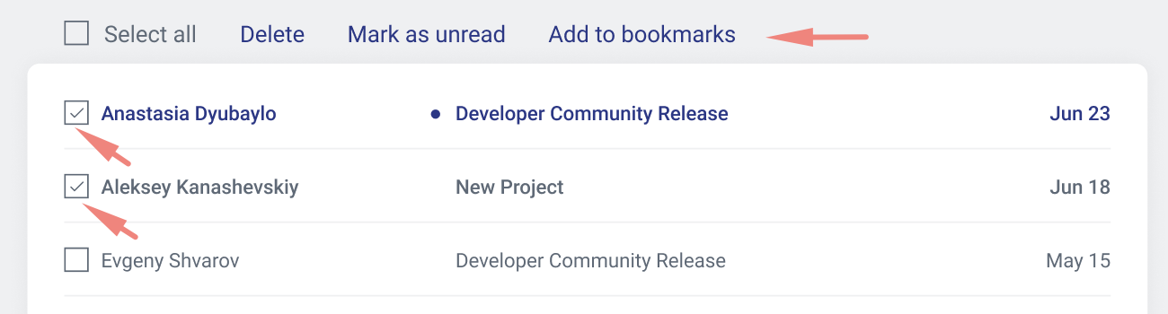 Para utilizar a nova funcionalidade, selecione um/múltiplos/todas as mensagens. As novas funcionalidades aparecerão no topo:
