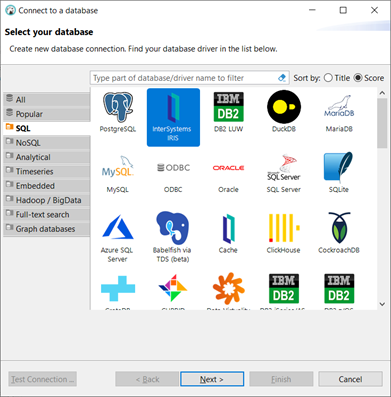 3. Escolha a aba SQL > InterSystems IRIS e clique next: