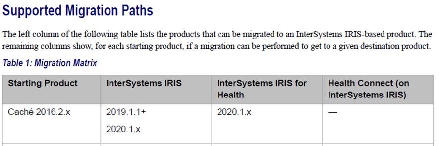 No documento oficial que você pode executar o download através do WRC: “How to Migrate to InterSystems IRIS” existe um tópico chamado: “Supported Migration Paths”, neste tópico existe uma matriz da versão origem e qual versão destino do IRIS são compatíveis, um exemplo: