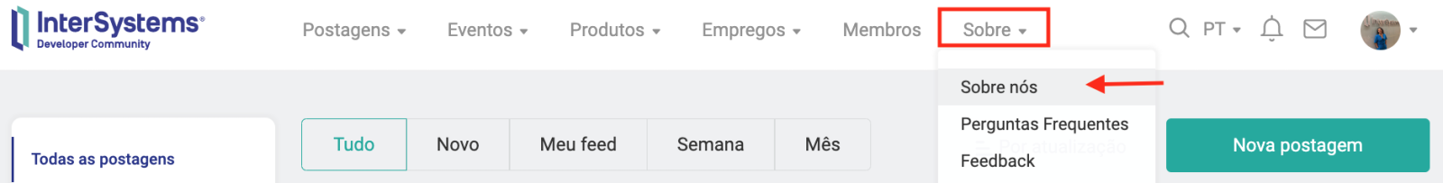 Para alcançá-lo, basta ir ao menu superior, abrir a seção Sobre e escolher Sobre nós: