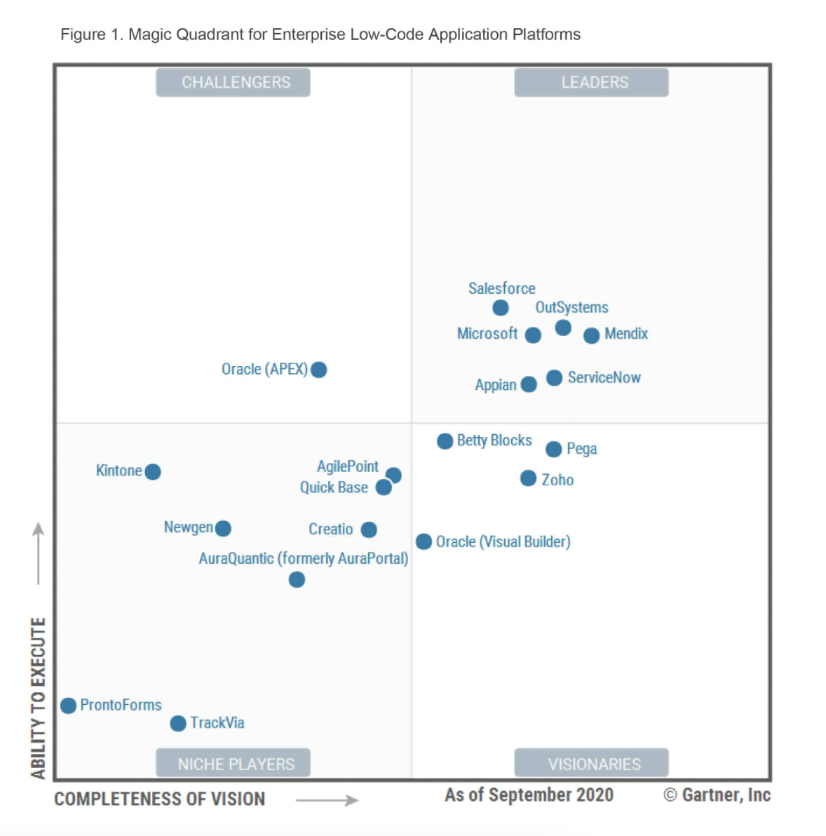 Porque não!? Aplicações low-code tem ganho grande destaque no mercado nos últimos anos e a imagem abaixo mostra o "Magic Quadrant" atual fornecido pela Gartner para plataformas empresariais de aplicação low-code. O que mostra o quão interessante é esse mercado.