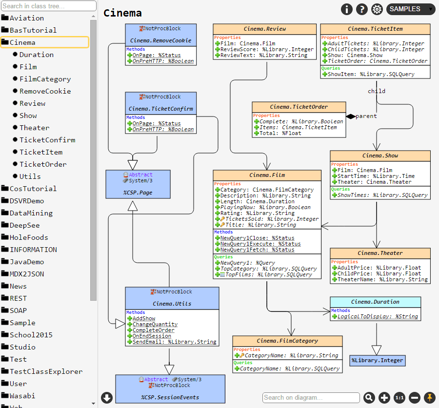 Para melhor compreensão de tudo o que se segue neste artigo, veja como as classes são visualizadas no Class Explorer. Como exemplo, vamos exibir o pacote "Cinema" do namespace "SAMPLES":