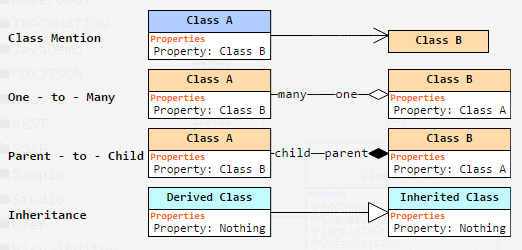 O Class Explorer usa uma versão estendida da notação UML para visualização, já que o Caché possui um conjunto adicional de entidades que não são suportadas no UML padrão, mas são importantes para o Caché: consultas, blocos xData, muitas palavras-chave para métodos e propriedades (como System, ZenMethod, Hidden, ProcedureBlock e outros), relações pai-filho e um-para-muitos, tipos de classe e assim por diante.