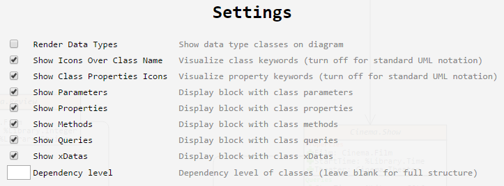 Por padrão, cada classe é exibida com um número de ícones gráficos. O significado de cada ícone pode ser esclarecido clicando no botão Ajuda no canto superior direito da tela. Se você precisar de uma notação UML mais ou menos estrita que é exibida por padrão, bem como a exibição de quaisquer seções de classe, isso pode ser desativado na seção de configurações.