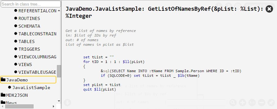 Você pode experimentar como o Class Explorer funciona no namespace padrão SAMPLES: demo. . E aqui está uma resenha em vídeo do projeto.