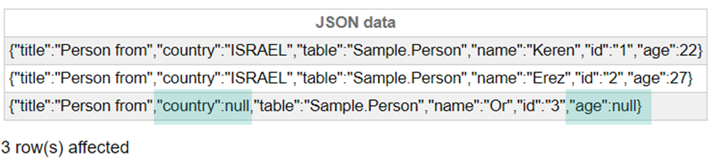 SELECT TOP 3 JSON_OBJECT('title':'Person from’,'country’:UCASE(Home_State),'table':%TABLENAME,'name':Name,'id':%ID,'age':Age ABSENT ON NULL) "JSON data"