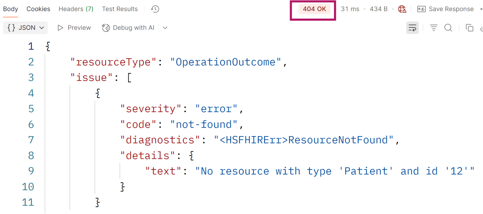 O exemplo específico de FHIR que mencionei é um caso interessante, pois um erro 404 poderia significar simplesmente que um recurso FHIR específico não foi encontrado (o ID que você tentou ler não está no repositório), e não que você tem algum problema no servidor ("página não encontrada").