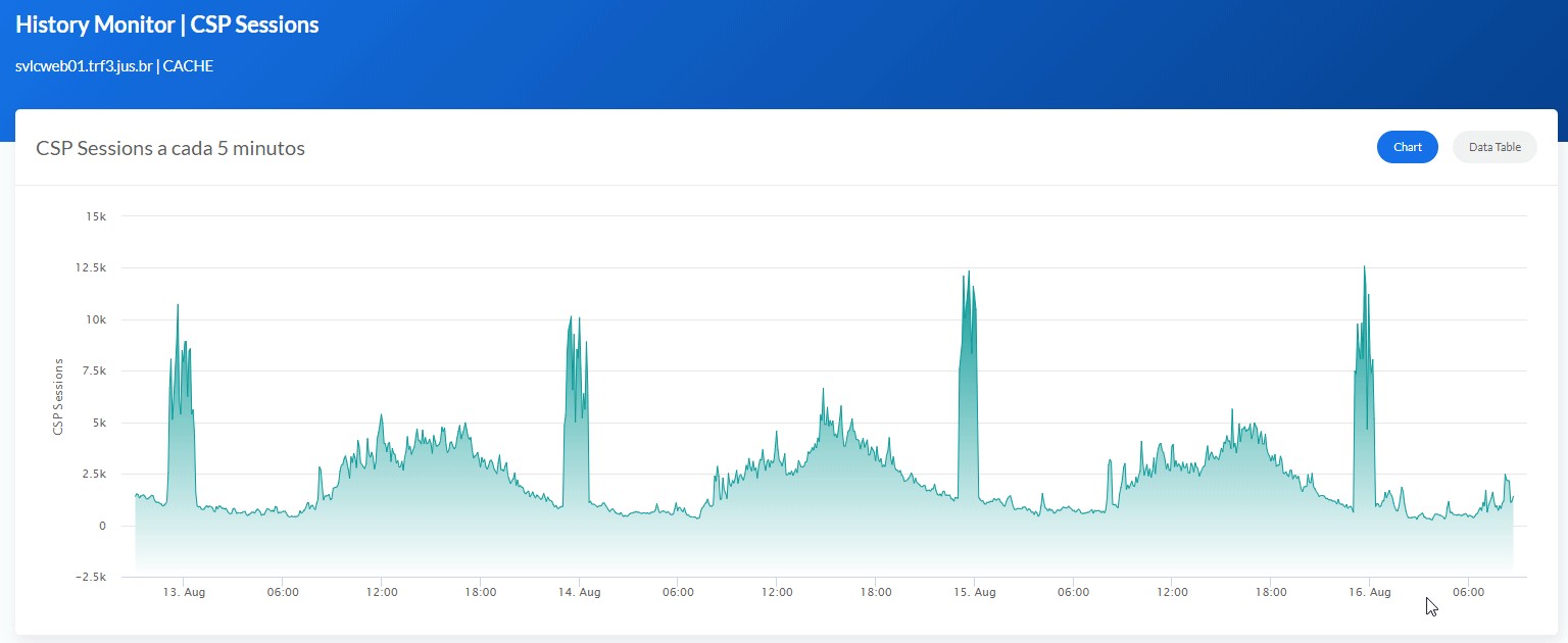 O monitor de dados históricos para Sessões CSP e Licenciamento exibem informações divididas em 3 seções: