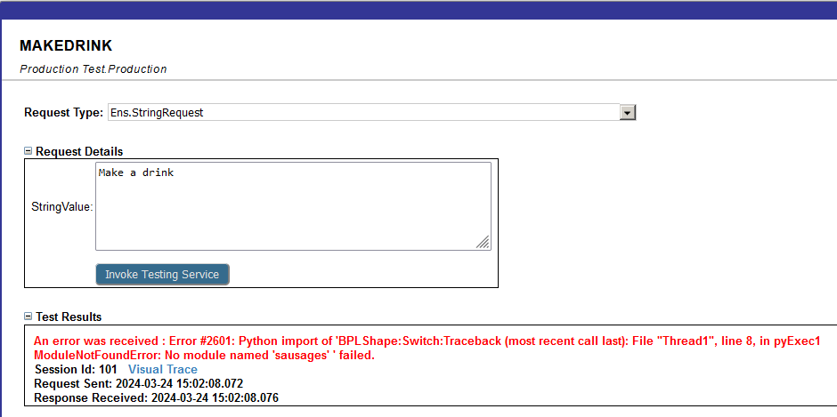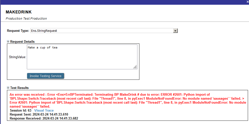 Quando falta alguma library Python, o business process será finalizado pela máquina de integração por padrão. Contudo, o time de suporte pode achar utilidade em lidar com erros específicos de uma maneira particular, enquanto uma remediação de longo prazo é providenciada. Com isso em mente, a importação Python tem um erro específico que pode ser tratado pelas configurações padrão da produção. Por exemplo: