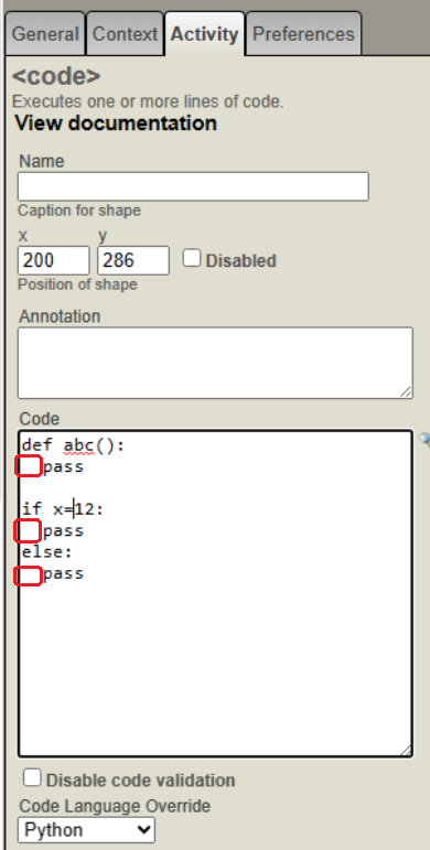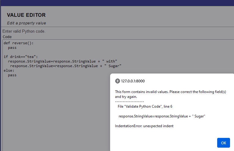 Se a indentação de código está incorreta, o editor valida enquanto salva e aponta a linha de código com o problema. A validação de indentação é oferecida tanto no painel de atividade quanto no editor de valor pop-out.