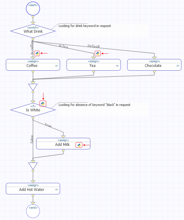 Diagramas BPL agora incluem um novo ícone de linguagem Python. Uma discreta, porém familiar dica de onde a linguagem Python é usada pelas atividades. Isso é útil durante o desenvolvimento incremental, mas também ajuda a guiar consultas de melhora e suporte futuras. Esse ícone vai aparecer sempre que a respectiva Atividade de Linguagem de Sobreposição estiver definida como Python.