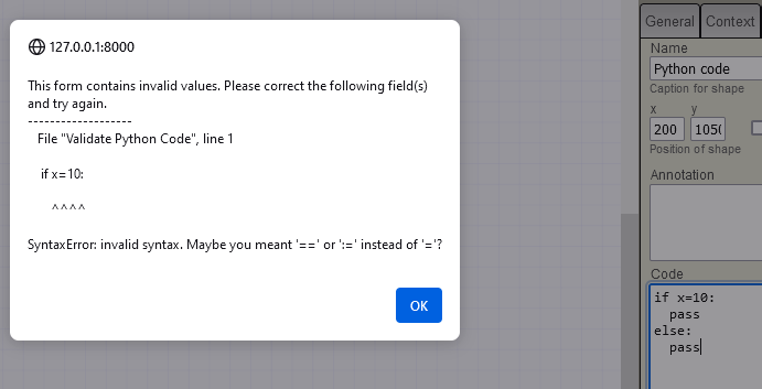 Para mitigar esse tipo de problema de câmbio de contexto, o código Python é validado para sintaxe bem formada, de moto que qualquer ajuda de erro é exibida através do editor.