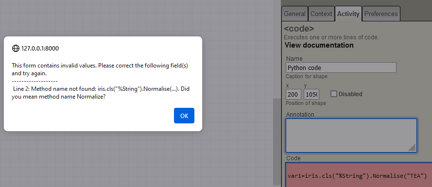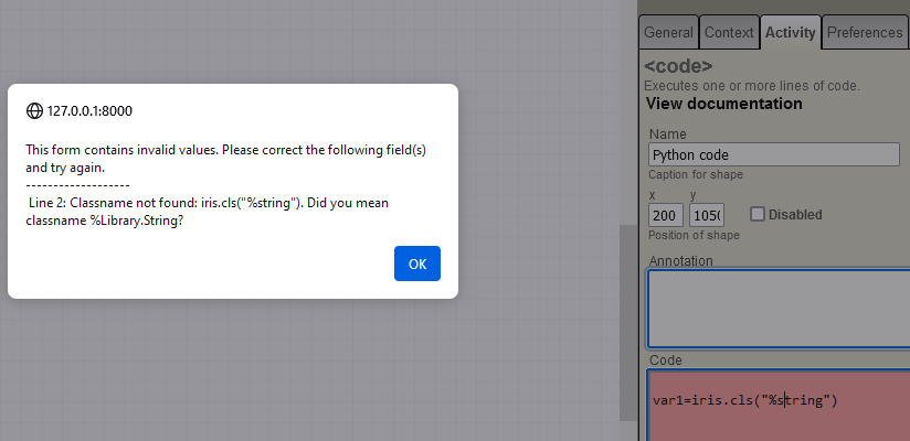 status.value=iris.cls('%SYSTEM.Status').Error(5001,"My custom error message")Note que o pacote "iris" está disponível em códigos ou expressões Python sem importação explícita. Isso é fornecido automaticamente pelo tratamento do BPL de integração. I.e.: