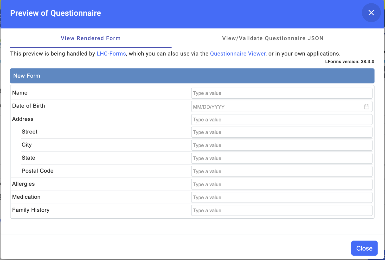 Comece projetando um questionário FHIR usando o National Library of Medicine(NLM) Form Builder. Esta ferramenta ajuda a criar formulários clínicos estruturados que seguem os padrões FHIR. Neste projeto, 100 respostas sintéticas de pacientes foram coletadas e salvas como arquivo JSON FHIR QuestionnaireResponse, prontas para serem importadas em um servidor FHIR.