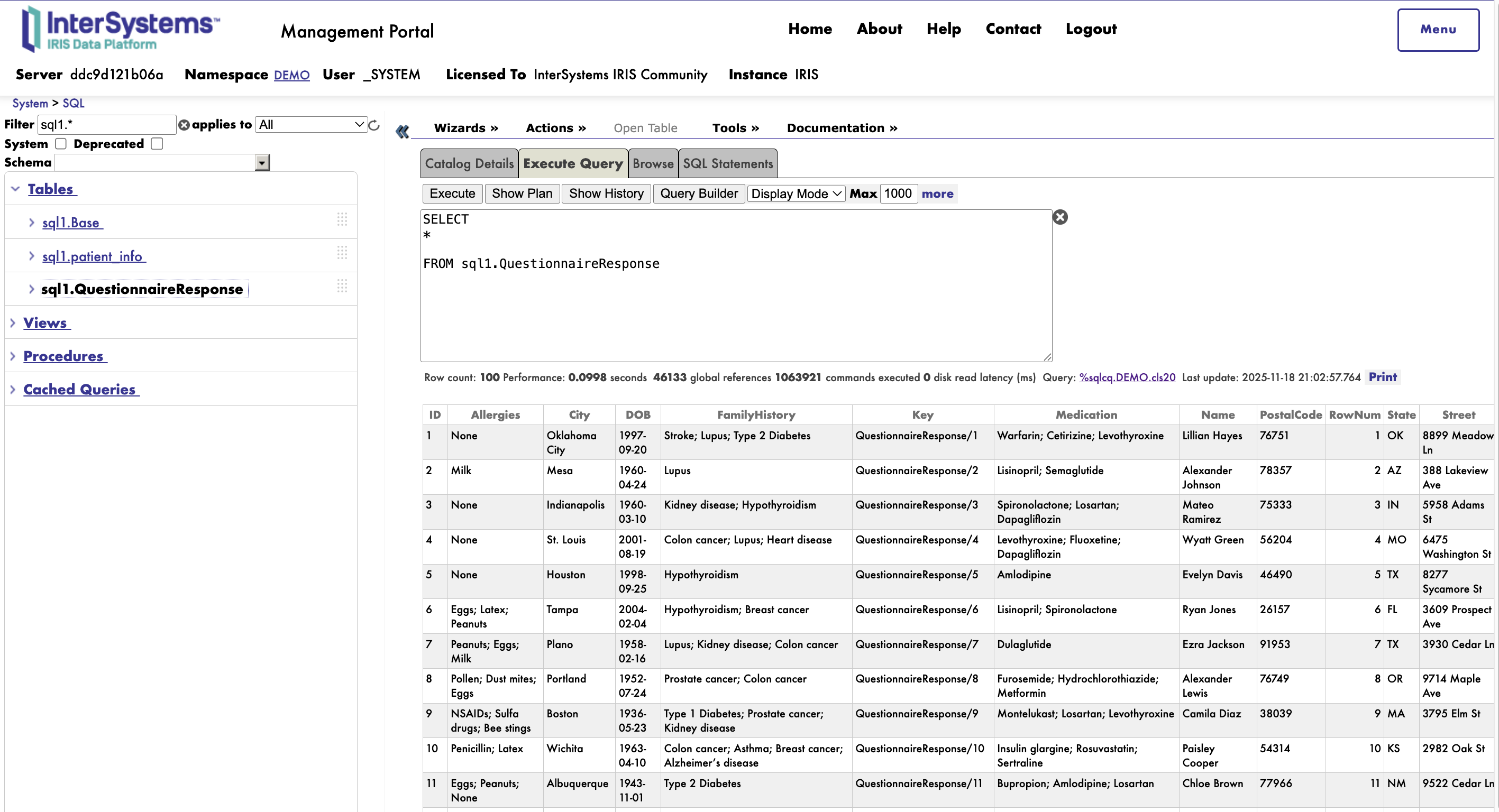 Após carregar os recursos FHIR QuestionnaireResponse no servidor, use o InterSystems IRIS FHIR SQL Builder para criar automaticamente tabelas SQL relacionais. Isso “achata” a estrutura JSON aninhada, permitindo uma análise fácil dos dados do questionário com SQL padrão — tudo configurável em apenas alguns cliques.