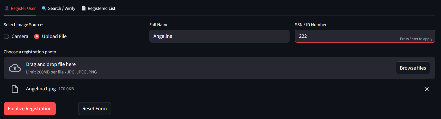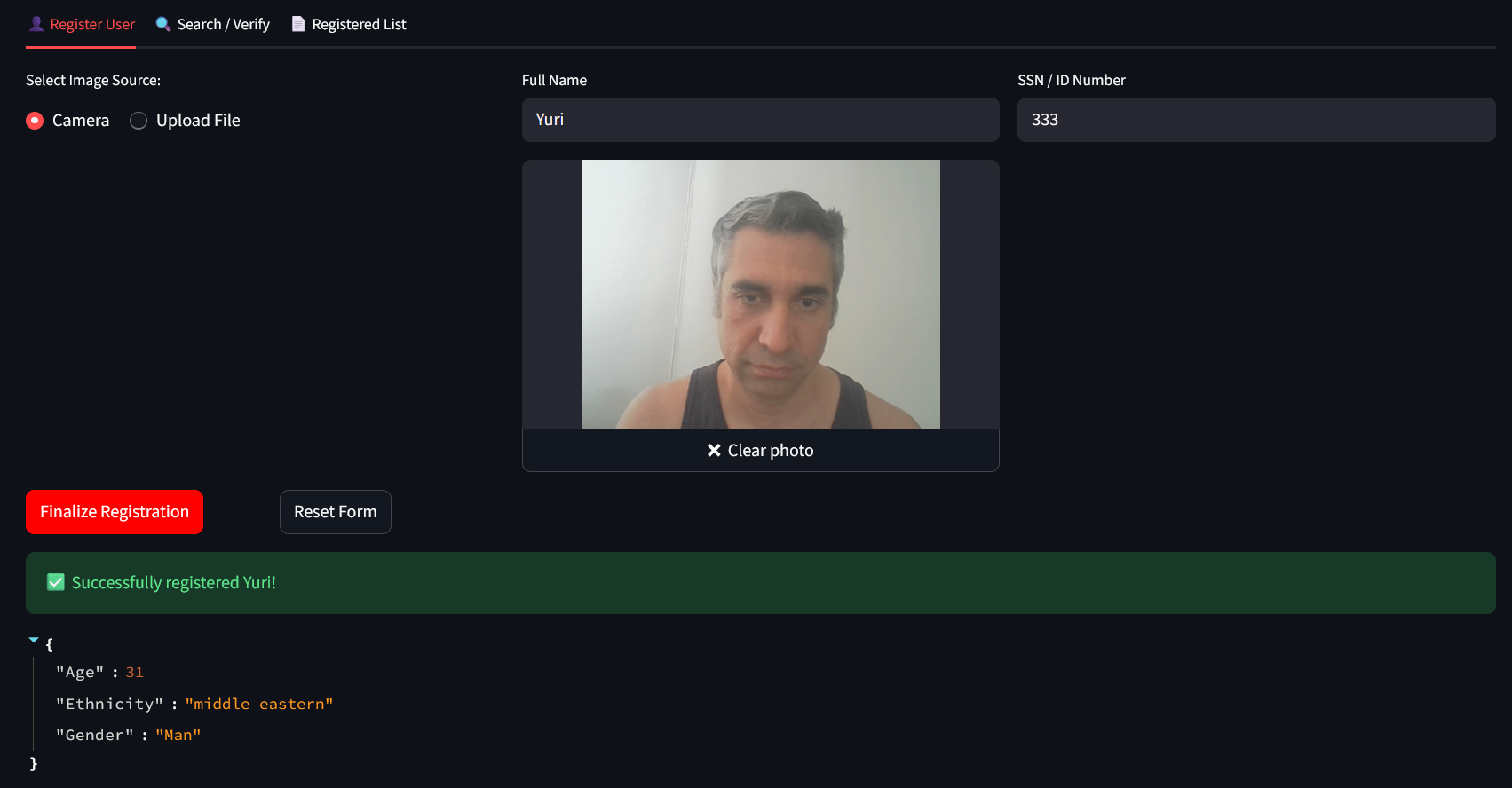 3. Cadastre algumas pessoas (selecione Câmera e Tirar Foto para capturar sua imagem com a câmera do seu computador ou faça o upload de arquivos. Clique em Finalizar Cadastro para salvar a pessoa no banco de dados IRIS e em Redefinir formulário para limpar o formulário e usá-lo novamente):