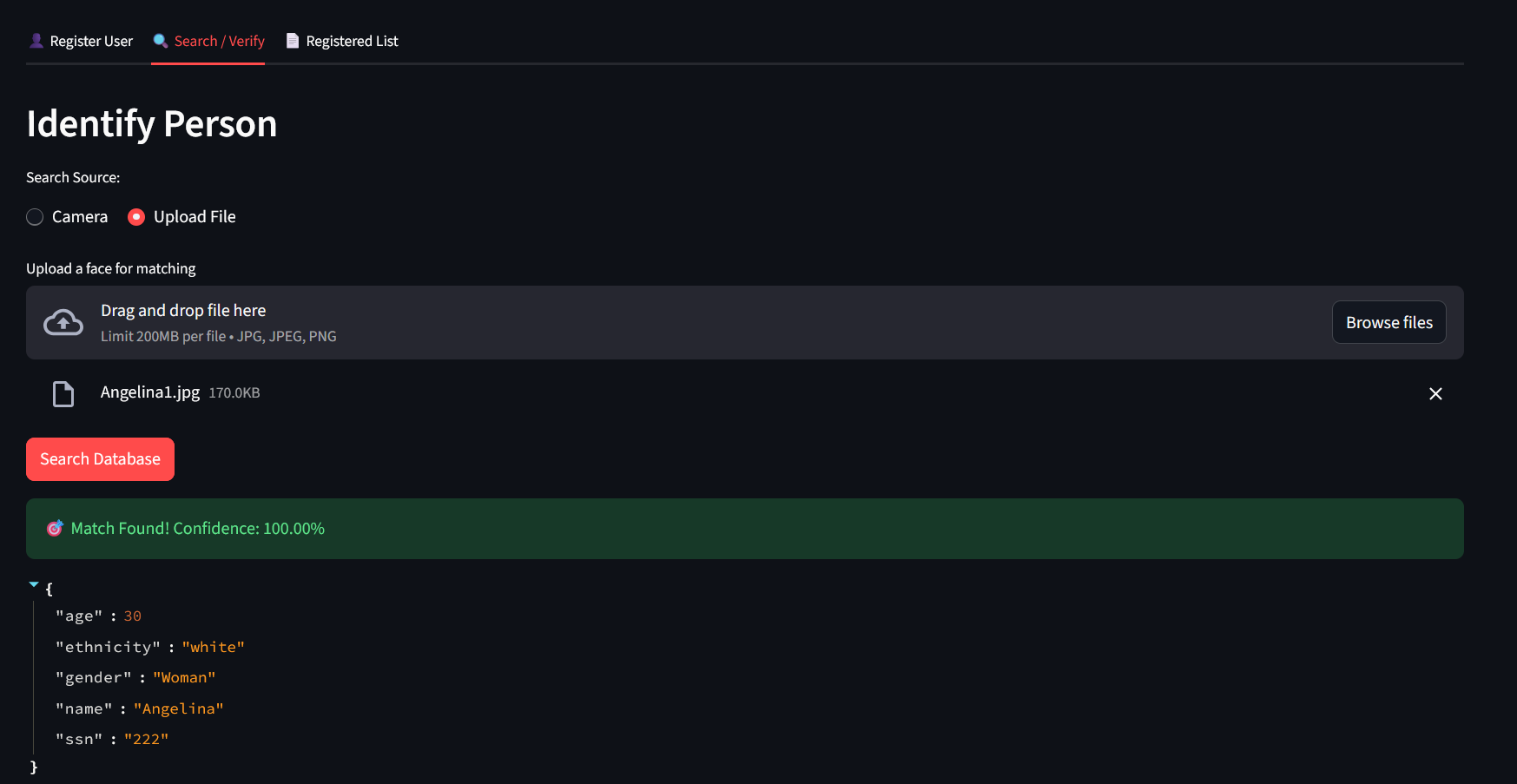 4. Encontre pessoas usando uma foto ou sua câmera para encontrar pessoas já cadastradas (use a aba Buscar/Verificar):