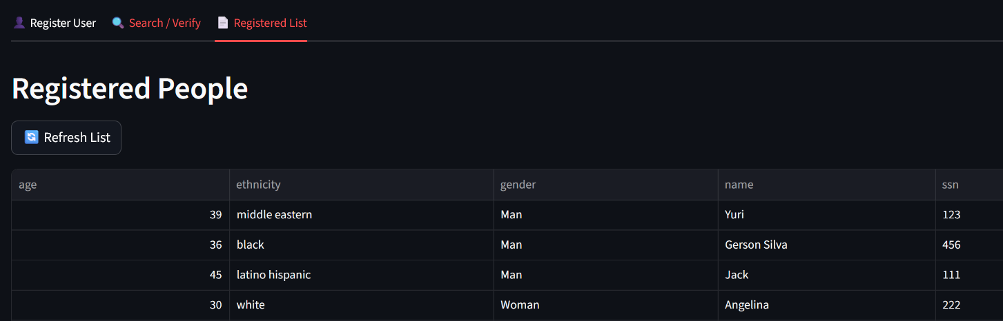 (SSN, Name, Age, Gender, Ethnicity, FaceVector)