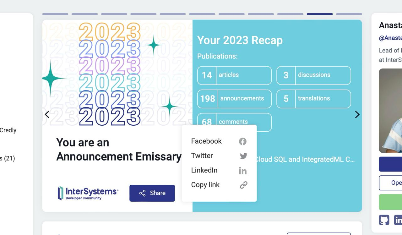 Assim como no ano passado, cada membro tem acesso ao resumo personalizado de atividades de 2023 - uma visão geral de suas contribuições, incluindo o número de postagens, comentários, visualizações, postagens/tags principais e favoritas e muito mais!