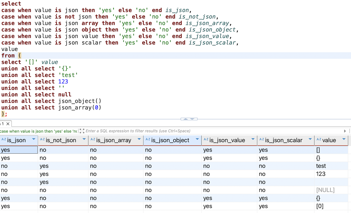 scalar-expression IS [NOT] JSON [keyword]O predicado IS JSON determina se um valor de dados está no formato JSON.