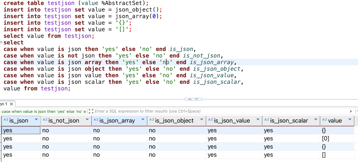USER>do ##class(%SQL.Statement).%ExecDirect(, "SELECT 'yes' is_json_object WHERE ? IS JSON OBJECT", {}).%Display()