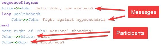 <div class="mermaid"> sequenceDiagram Alice->>John: Hello John, how are you? loop Healthcheck John->>John: Fight against hypochondria end Note right of John: Rational thoughts! John-->>Alice: Great! John->>Bob: How about you? </div>