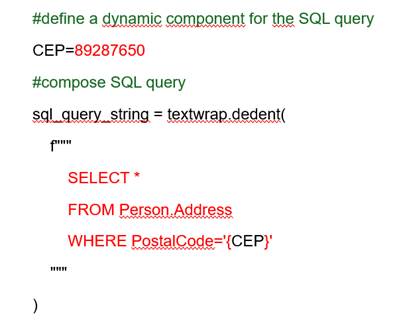 Caso sua necessidade seja interações entre o cliente e a aplicação (consequentemente o banco de dados), o Dynamic SQL pode ser mais apropriado, pois “molda-se” muito facilmente com estas alterações de consultas. Entretanto, este dinamismo tem um custo, a cada consulta nova, ela é remodelada, podendo ter um custo maior para a execução. Abaixo um exemplo simples de um trecho de código Python.