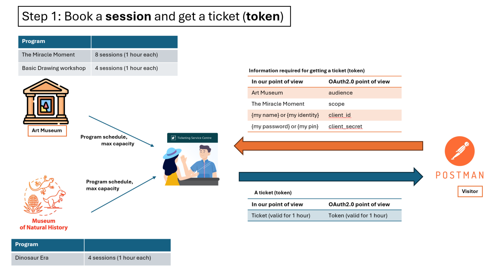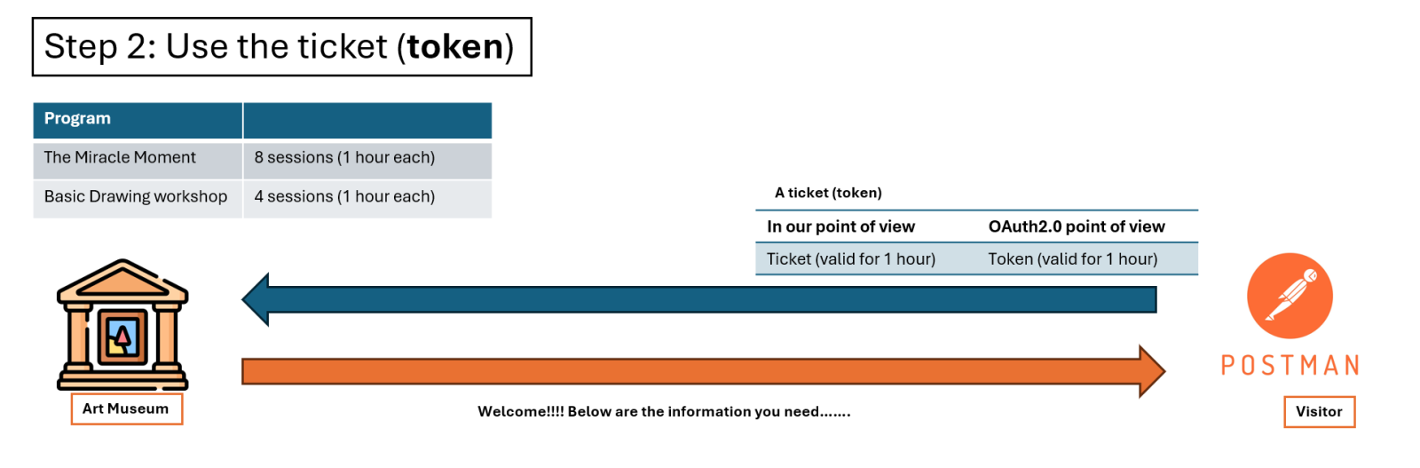 Considere o seguinte cenário: você deseja visitar um Museu de Arte para um evento especial chamado "O Momento Milagroso". Como este evento é muito popular, o Museu decidiu configurar um controle de fluxo, dividindo o horário de abertura em 8 sessões, cada sessão com duração de 1 hora, e o visitante deve reservar sua própria sessão na Bilheteria antes da visita. Em outras palavras, o visitante deve apresentar um bilhete válido (token) no horário correto (sessão) ao Museu de Arte para o evento "O Momento Milagroso".