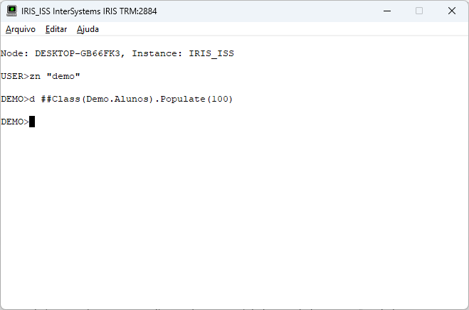 Note que estamos utilizando a superclasse %Populate na nossa classe Demo.Alunos. Esta superclasse nos permite popular a nossa tabela com dados que serão criados baseado no tipo de cada propriedade. Para mais detalhes do %Populate veja o link https://docs.intersystems.com/irislatest/csp/docbook/DocBook.UI.Page.cls?KEY=GOBJ_populate