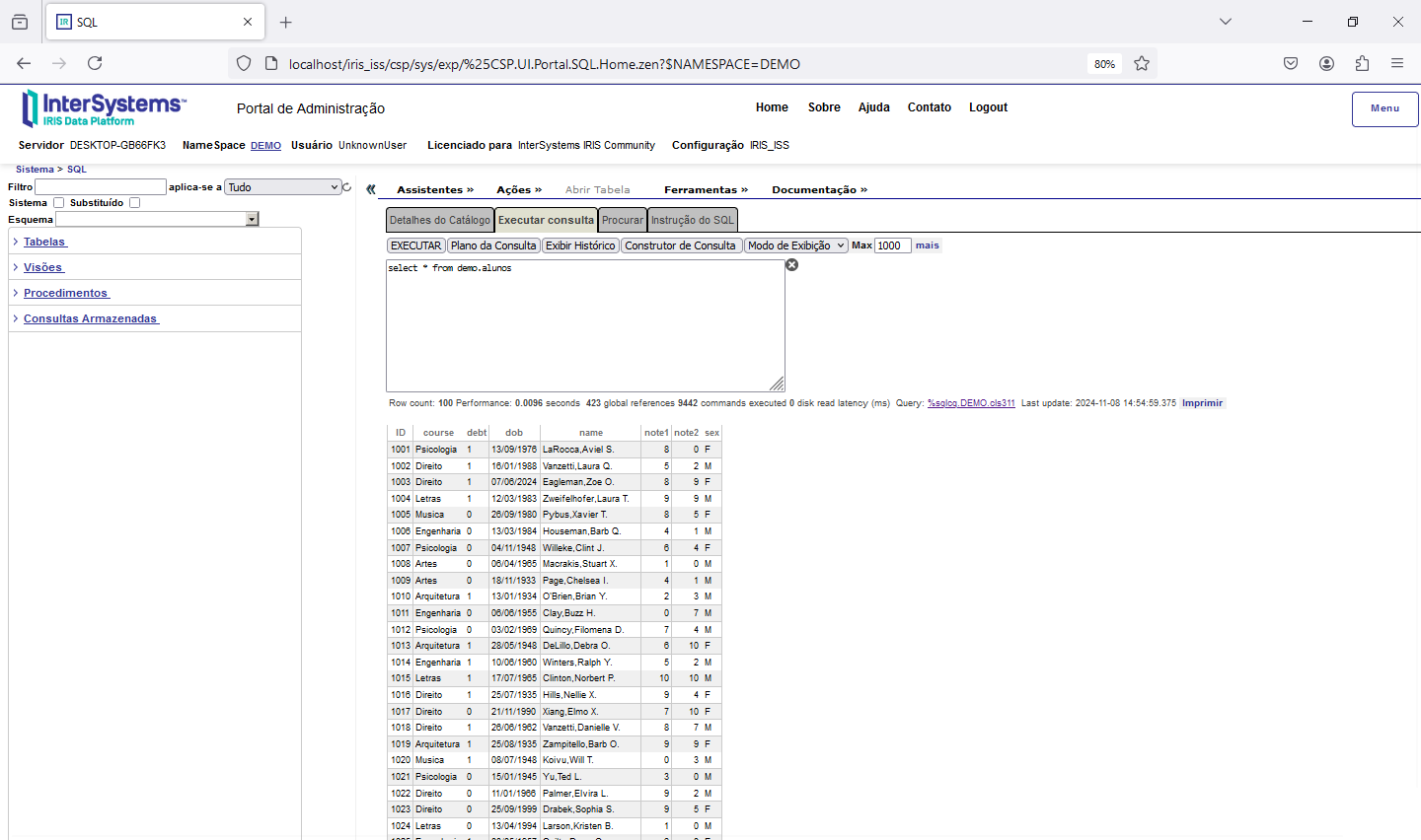 Após criar os registros vamos verificar como ficou a nossa tabela. Abra o SQL Explorer no Portal de Administração do IRIS e veja o conteúdo da tabela: