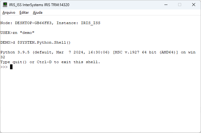 Uma vez instalado e configurado o python vamos abrir o shell python a partir do terminal do IRIS apenas para verificar se está tudo ok. Veja a tela a seguir:
