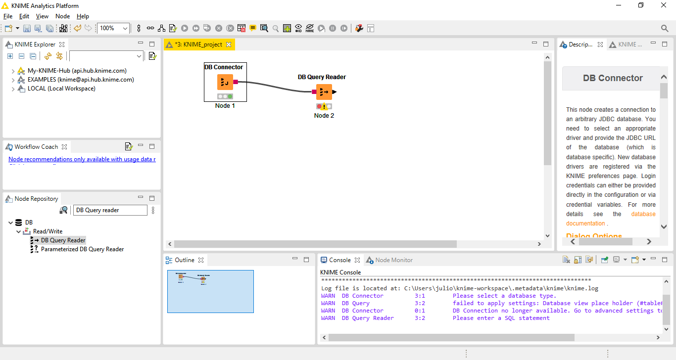 Após arrastar o node para o nosso fluxo vamos ligar o DB Connector a nosso novo node, informando que estes componentes formam um fluxo. Para isso clique na saída do DB Connector e arraste para a entrada do DB Query Reader. Uma conexão entre eles será criada: