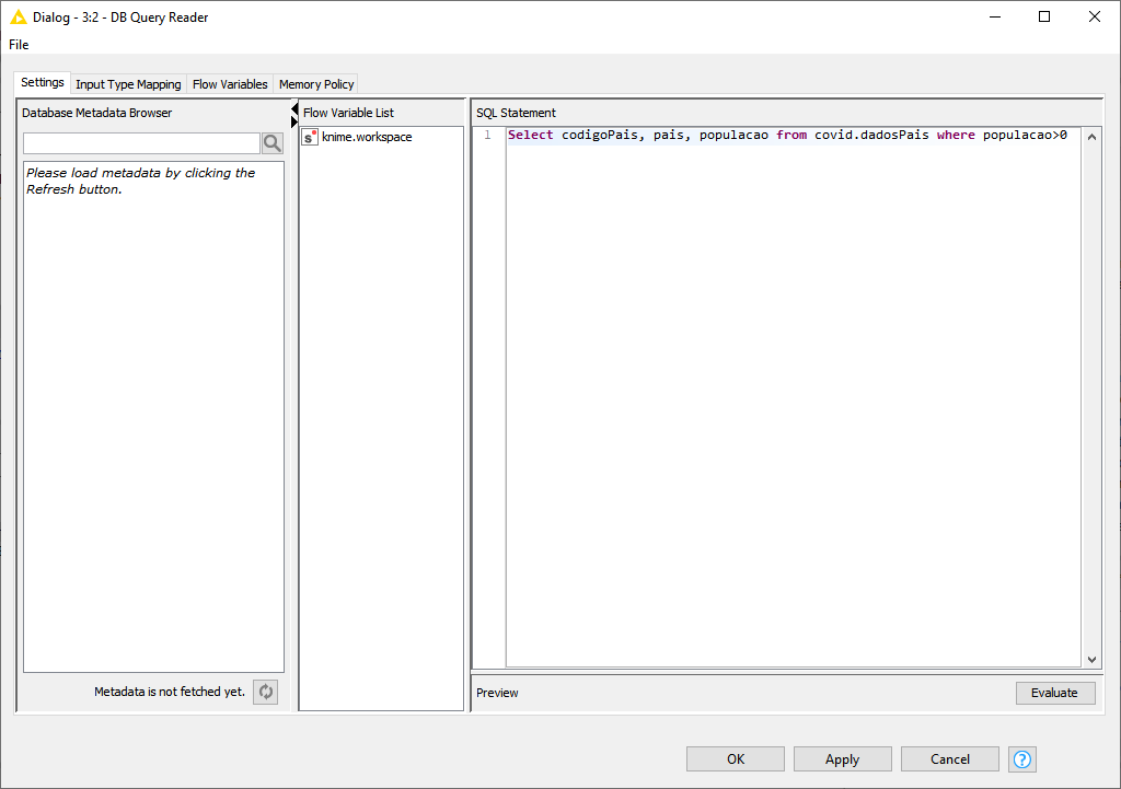 Classpath: Classe do JDBC do Iris – Ver na tela de configuração do KNIME abaixo;