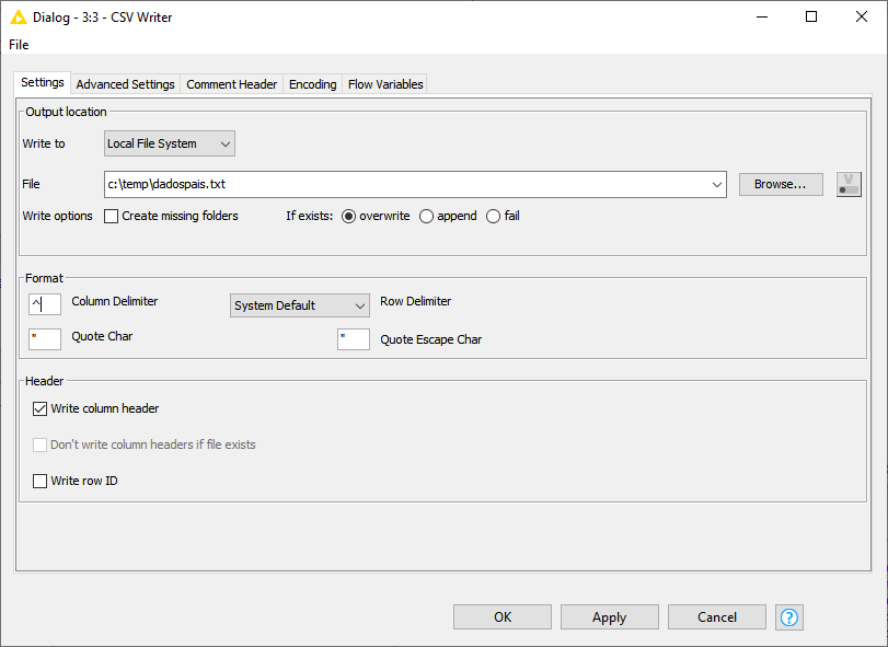 Agora clicando com o botão da direita sobre o node do CSV Writer, clique em Configure e informe os dados solicitados. Aqui podemos informar o arquivo que será criado, o que fazer caso o arquivo exista, delimitadores e header do arquivo. Ao final clique em Apply->OK