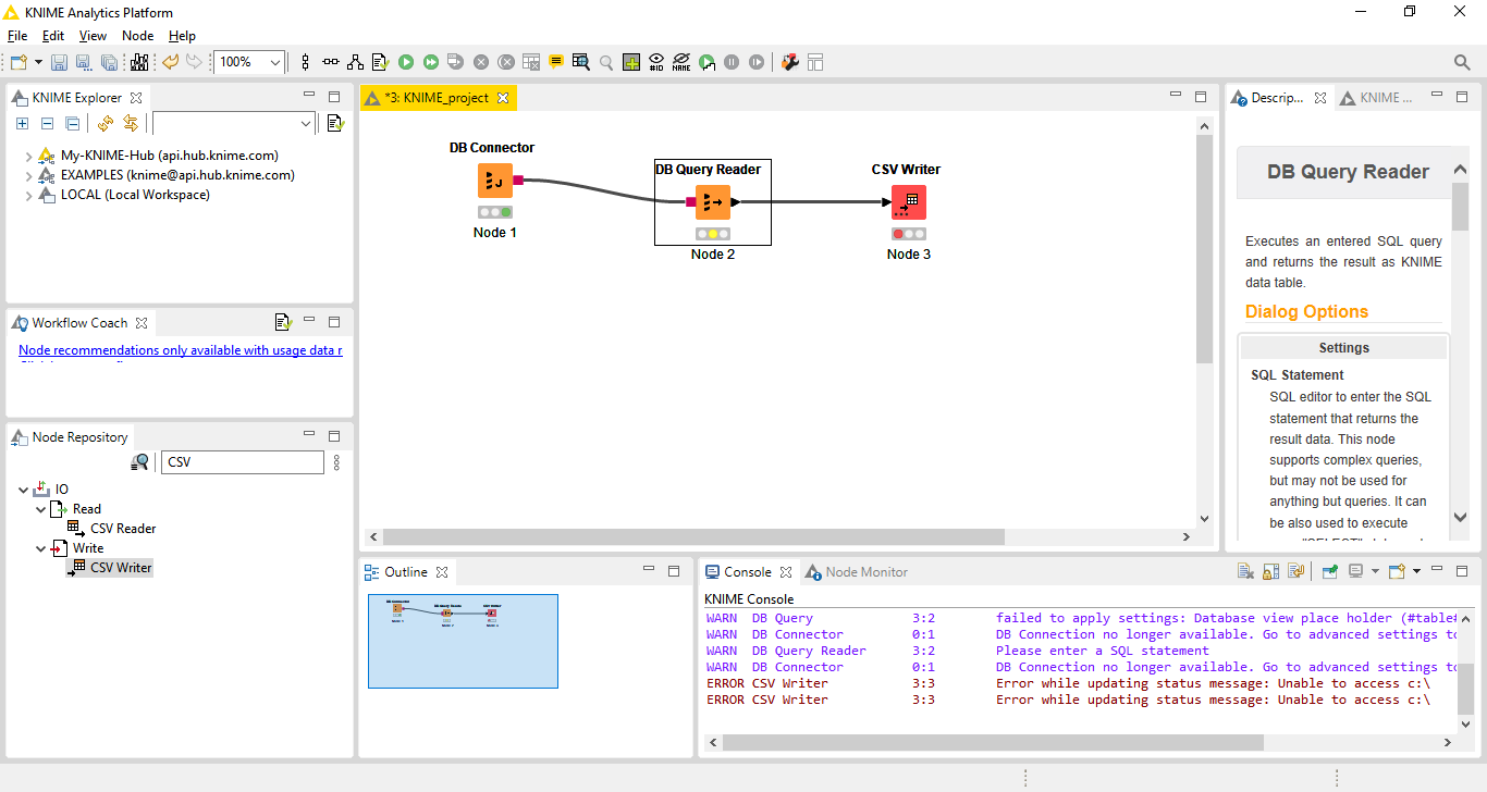 Importante: Não esqueça de ligar a saída do DB Query Reader ao CSV Writer da mesma forma que fizemos com o DB Connector e o DB Query Reader (saída do node->arrastar para entrada do próximo node):