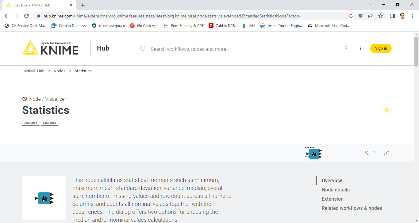 Podemos ir além, ligando outros nodes a saída da nossa query. Um exemplo é o node de Statistics. Vamos busca-lo no site do KNIME. Para isso abra seu navegador e na barra de endereços digite “KNIME Statistics node”. A primeira opção no Google é o Statistics – KNIME Hub. Abra a página e você terá acesso a este node: