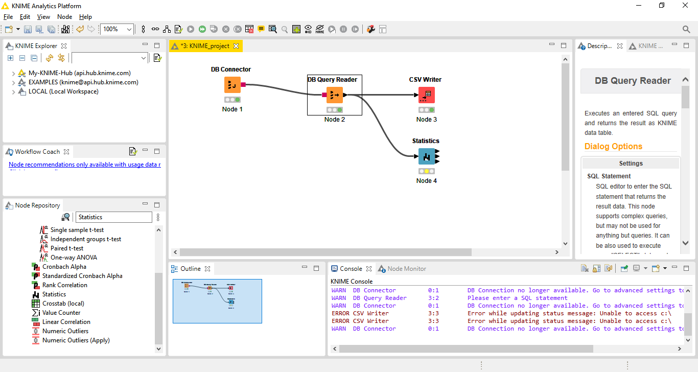 Uma interface gráfica de usuário e o uso de JDBC permitem a montagem de nós combinando diferentes fontes de dados, incluindo pré-processamento (ETL: Extract, transform, load), para modelagem, análise e visualização de dados sem necessidade (ou com necessidade mínima) de programação.